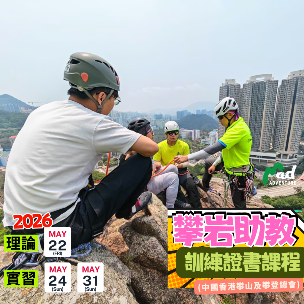 課程資訊 2026年5月:攀岩助教證書課程 (HKCMCU) 課程:攀岩助教訓練證書課程 (HKCMCU)名額:最多8人截止日期: 先到先得,額滿即止⏰日期及時間 ⏰# 理論課:2026年5月22日(五) 19:15 – 22:15 (3小時)實習課:2026年5月24日(日) 09:00 – 18:00 (8小時) 及 2026年5月31日(日) 09:00 – 18:00 (8小時)後備實習課:2026年6月7日(日)# 完成課程(出席率必須達100%)並合格後,可獲由「中國香港攀山及攀登總會」 簽發之「 攀岩助教訓練證書 」 地點 理論課:BoulderMAD Climbing Gym (牛頭角鴻圖道26號)實習課:飛鵝山 (實際地點將於理論課公布) 5月班報名表格 第30期 - 2026年4月:一級攀岩證書課程 (HKCMCU) 「一級攀岩訓練證書課程」 課程難度:入門級別,適合新手課程目標:引起參加者對攀岩的興趣,體驗登頂一刻的滿足感課程裝備:課程會提供所有必用裝備,不用加購課程內容:基本繩結、攀爬技巧、頂繩防護、沿繩下降,超豐富! 課程:一級攀岩證書課程 (HKCMCU)名額:最多20人截止日期: 先到先得,額滿即止 日期及時間 # 理論課:2026年4月17日(五) 19:00 – 22:00 (3小時)實習課:2026年4月19日(日) 09:00 – 18:00 (8小時)# 完成課程(出席率必須達100%)並合格後,可獲由「中國香港攀山及攀登總會」 簽發之「一級攀岩訓練證書」 地點 理論課:BoulderMAD Climbing Gym (牛頭角鴻圖道26號)實習課:飛鵝山 (實際地點將於理論課公布) 4月班報名表格